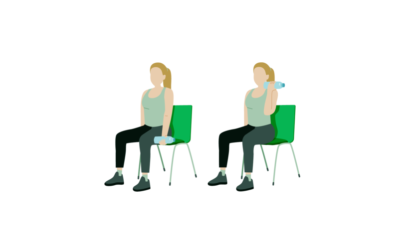 Bei dieser Übung sollen Sie auf einem Stuhl sitzend 30 Sekunden lang mit einem Arm die Hantel anheben, indem Sie den zunächst nach unten gestreckten Arm anbeugen und so die Hantel bis auf Schulterhöhe anheben, wie in der Illustration gezeigt.