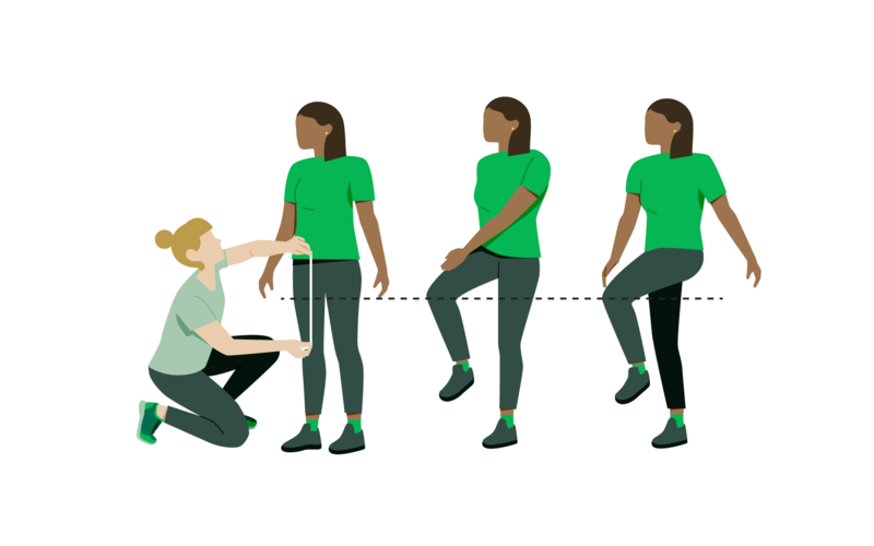 Um Ihre Ausdauer zu ermitteln, müssen Sie in dieser Übung zwei Minuten lang Ihre Knie abwechselnd heben. Und zwar mindestens bis zu einer bestimmten Höhe, die Sie vorab ermitteln und markieren. Diese entspricht der Hälfte der Höhe zwischen Kniescheibe und vorderem Hüftknochen. Am besten lassen Sie sich hier bei der Vorbereitung und Durchführung der Übung helfen.