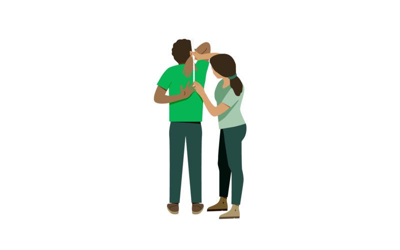 Sie können die korrekte Höhe mit einer Schnur bestimmen, die die Person, die Sie unterstützt, an Ihr Knie und Ihre Hüfte hält. Das untere Ende wird dann zum oberen geführt und diese halbe Länge – auf Höhe der Mitte des Oberschenkels – mit einem Stück Klebeband an der Wand neben Ihnen markiert. In der Illustration können Sie das sehen.