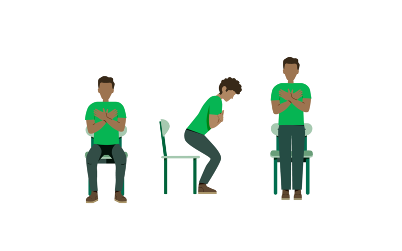 Bei dieser Übung sollen Sie eine Minute lang von einem Stuhl vollständig aufstehen und sich wieder hinsetzen – daher wird der Test auch „1-Minuten-Aufsteh-Absitz-Test“ oder auf englisch „Sit-to-Stand-Test“ genannt. Damit Sie dabei nicht die Arme zur Hilfe nehmen, verschränken Sie diese während der Übung vor der Brust, wie in der Illustration gezeigt. Sie müssen bei der Übung jeweils ganz aufstehen, so dass die Beine gestreckt sind und der Oberkörper aufrecht ist. Beim Hinsetzen muss die Stuhlfläche zumindest mit dem Gesäß berührt werden. Pausen können Sie machen, falls es notwendig ist, die Zeit läuft dabei aber weiter.