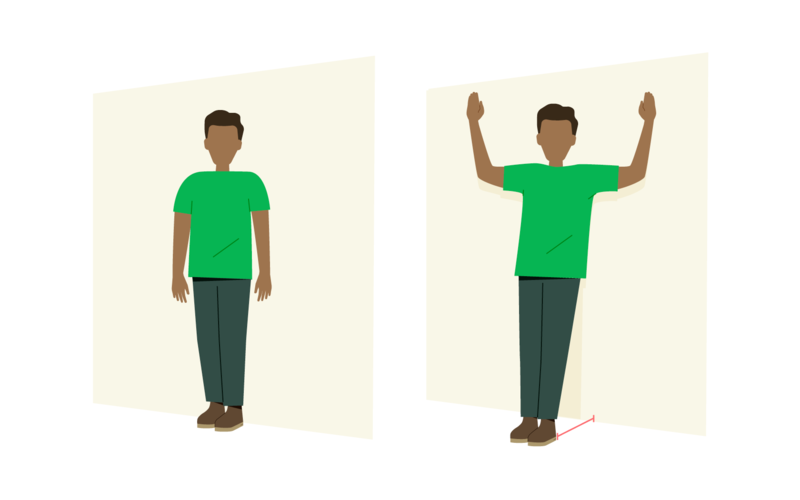 Sie können sie folgendermaßen beurteilen: Lehnen Sie sich an eine Wand, so dass Gesäß, Rücken, Schultern und der Kopf die Wand berühren. Rücken Sie nun 1,5 Fußlängen von der Wand weg und heben Sie die Arme seitlich am Körper an der Wand nach oben, mit den Handflächen nach vorne, wie in der Illustration gezeigt. Machen Sie dabei kein Hohlkreuz!