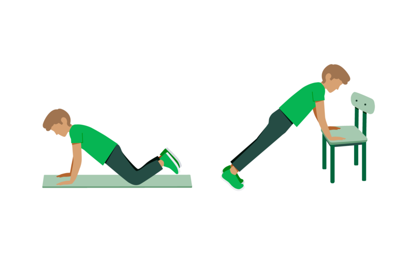 Bei dieser Übung wird die Kraft Ihres Armstreckers und Ihrer Brustmuskulatur getestet. Sie machen dafür, wie in der Illustration gezeigt, Liegestütze. Das machen Sie entweder auf den Knien oder an einem Stuhl, falls Sie Ihre Knie nicht belasten wollen oder können. Führen Sie die Liegestütze mit mäßiger Geschwindigkeit aus – etwa eine Sekunde sollte eine Bewegungsrichtung dauern.